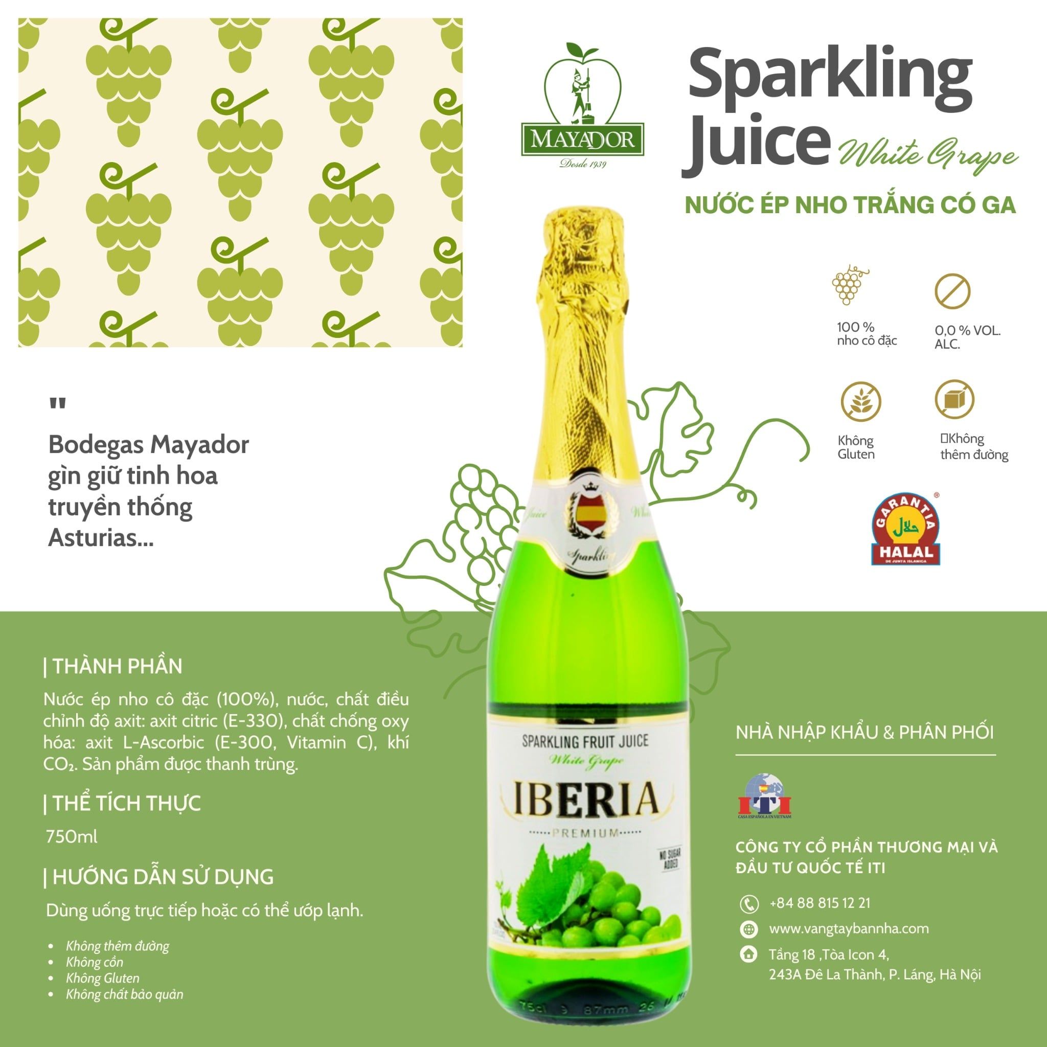 - Đặc điểm: Nước ép nho đỏ có ga là thương hiệu Mayador của Tây Ban Nha, được làm từ 100% nước ép nho trắng cô đặc. Sản phẩm chất lượng với chứng nhận quốc tế (ISO, IFS, Kosher, Halal), mang hương vị tự nhiên, tinh tế, phù hợp cho mọi lứa tuổi và mọi dịp sum họp.